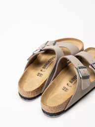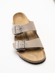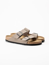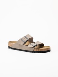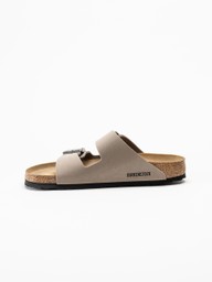 Beige slip-in sandaler Arizona Birko-Flor från Birkenstock i färgen Gray Taupe med en tidlös och stilren design. Ovandelen är tillverkad i syntet Birko-Flor, som ger ett slitstarkt och lättskött material, med textilfoder för extra komfort. Modellen har två justerbara remmar med silverspännen som gör det enkelt att anpassa passformen efter foten. Den klassiska Birkenstock-fotbädden i kork och mocka ger ergonomiskt stöd och en naturlig känsla vid varje steg. Yttersulan i EVA är lätt och ger bra grepp och stabilitet. Regular fit gör modellen passande för normal till bred fot, och den unisexa designen gör den till ett mångsidigt val för alla. Att tänka på: Modellen upplevs vara något stor i storleken, så det kan vara bra att överväga en mindre storlek.