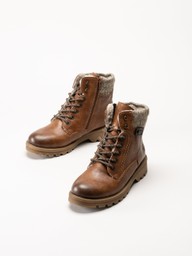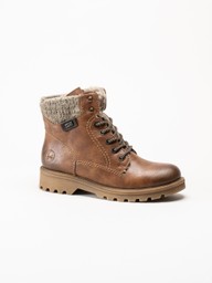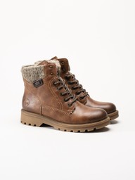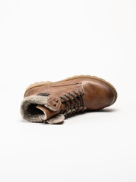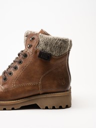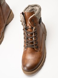 Bruna fodrade kängor från Rieker i färgen Zimt. En modell med varm och behaglig nyans som passar perfekt till höstens och vinterns garderob. Kängorna är tillverkade av syntet, vilket ger en lätt och flexibel känsla samtidigt som de är slitstarka och vattenavvisande tack vare RiekerTEX-membranet. Insidan är fodrad med mjuk teddy pile som håller fötterna sköna och varma även under kalla dagar, medan innersulan i filt bidrar med extra komfort. Den räfflade yttersulan i gummiblandning ger stabilitet och bra grepp på olika underlag. Kängorna har snörning framtill för justerbar passform och en dragkedja på insidan som gör dem enkla att ta av och på. Den mjuka textilkragen runt skaftet ger en bekväm känsla och ett snyggt avslut. Utrustade med Riekers Antistress-teknologi som gör skon lätt, stötdämpande och följsam i steget - ett perfekt val för vardag och vinterpromenader.