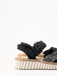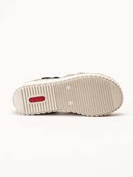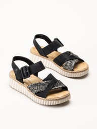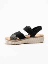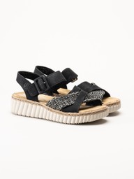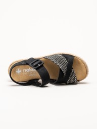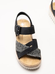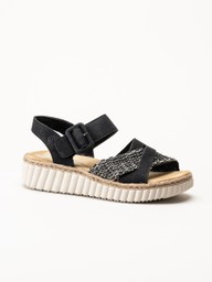 Svarta sandaler från Rieker med en stilren och bekväm design. Ovandelen är tillverkad i en kombination av syntet och raffia, där raffiadetaljen har ett stickat uttryck som ger en naturlig och trendig look. Modellen har en rem över vristen med kardborreöppning och dekorativt spänne som gör det enkelt att justera passformen efter foten. H-lästen ger extra utrymme och passar dig som önskar en bredare passform. Den lilla kilklacken bidrar till en bekväm höjd och stabil gång. Invändigt är sandalen fodrad med textil, och innersulan i textil med Riekers Antistress-teknologi ger mjuk dämpning och hög komfort under hela dagen. Yttersulan i gummiblandning ger bra grepp och stabilitet. En lätt och bekväm sandal som passar perfekt för både vardag och sommarens lediga tillfällen.