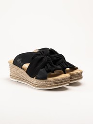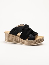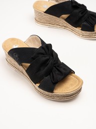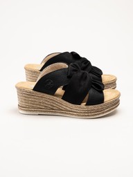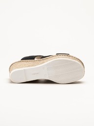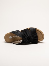 Svarta sandaletter med kilklack från Rieker med en stilren och komfortfokuserad design. Ovandelen är tillverkad i en kombination av syntet och textil med breda remmar och en mjuk rosett som ger ett feminint och följsamt uttryck. Invändigt är sandalet fodrad med textil, och innersulan i textil med Riekers Antistress-teknologi ger extra komfort och dämpning vid varje steg. Kilklacken på ca 6,5 cm är klädd i juteimitation och ger både höjd och stabilitet. Yttersulan i syntet ger bra grepp på olika underlag. En bekväm och elegant sandalett som passar perfekt för både vardag och sommarens festligare tillfällen.