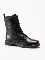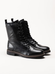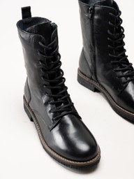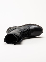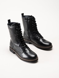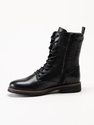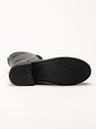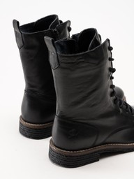 Svarta höga kängor i skinn Rosa Negra Black. Höga kängor i svart skinn med rundad tå och snörning med 10 hål som ger en justerbar och säker passform. Modellen har en dragkedja på insidan som gör skorna enkla att ta av och på. Insidan är fodrad med textil och innersulan i skinn ger en följsam känsla mot foten. Kängan har en dekorativ stickning runt kanten och en yttersula i gummi med crepe-liknande textur som ger bra grepp. En stilren känga med högre skaft som fungerar utmärkt under höst- och vintermånaderna.